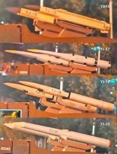 Foto-foto yang beredar di media sosial menunjukkan rudal-rudal baru bertanda YJ-15, YJ-17, YJ-19, dan YJ-20 yang dibawa oleh kendaraan dalam parade. “YJ” adalah singkatan dari Ying Ji, yang berarti “Eagle Strike” dalam bahasa Mandarin, dan digunakan untuk berbagai rudal anti-kapal Cina, yang dapat diluncurkan dari kapal atau pesawat.