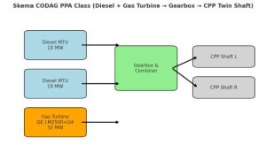 Pada prinsipnya, CODAG menggabungkan mesin diesel (efisien untuk jelajah) dengan gas turbin (tenaga besar untuk kecepatan tinggi, >30 knot). Adopsi CODAG Memberi fleksibilitas: hemat bahan bakar saat patroli, tapi bisa sprint cepat jika diperlukan.