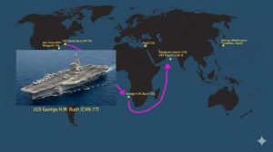 Ada pemandangan menarik sekaligus langka dalam pergerakan armada laut Amerika Serikat baru-baru ini. Kapal induk bertenaga nuklir USS George H.W. Bush (CVN-77) dilaporkan mengambil rute jauh dengan mengelilingi Benua Afrika melalui Tanjung Harapan, Afrika Selatan, untuk mencapai perairan Samudera Hindia dan Teluk Persia.