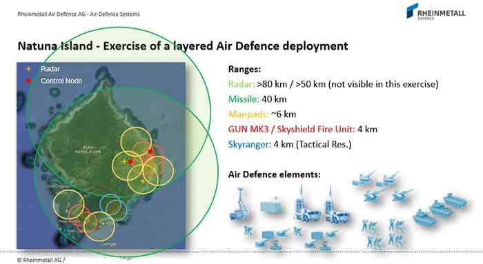 Seperti terlihat dalam gambar di atas, Rheinmetall memproyeksikan sistem hanud tak hanya di Lanud Ranai, tapi juga ke Lanal dan selat wilayah selatan pulau. Meski fokus kekuatan pada point defence di ketiga obyek vital, Rheinmetall menawarkan solusi hanud terminal untuk Natuna, yakni dengan mengintegrasikan keberadaan rudal hanud jarak sedang. Artinya lawan diharapkan dapat dihancurkan sebelum berhasil melintasi pulau.