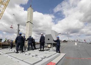 Pelaut Angkatan Laut AS di kapal perusak USS Dewey mengisi ulang rudal hanud Standard Missile-2 di Darwin, Australia, pada 20 September 2024.