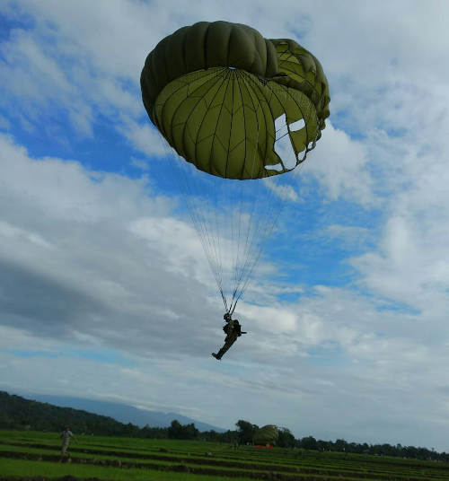 Setelah sehari sebelumnya melaksanakan ground training, tepat hari ini, Kamis (5/7/2018), ratusan pasukan lintas udara dari Batalyon Infanteri Para 433 Raider Julu Siri Divisi Infanteri 3 Kostrad, melaksanakan aksi terjung payung Desa Bontonyeleng, Kecamatan Gantarang Kab. Bulukumba, Sulawesi Selatan. Dengan menggunakan satu unit C-130 Hercules TNI AU, dilakukan penerjunan statik oleh 350 penerjun dan 30 penerjun free fall. (more…)