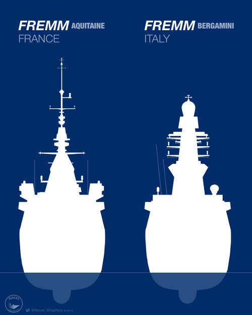 Walau Italia lebih agresif dalam memperkenalkan FREMM-nya, sejatinya FREMM dirintis bersama antara Italia dan Perancis. Dari Italia FREMM disokong Fincantieri dan dari Perancis ditangani DCNS/Armaris. Karena dibangun untuk kebutuhan AL Italia dan AL Perancis. Maka kedua negara membabtips FREMM dalam dua nama yang berbeda, Italia menyebutnya sebagai Bergamini class, dan Perancis menyebut sebagai Aquitaine Class. Dan pesanan pertama meluncur untuk AL Perancis pada November 2012.